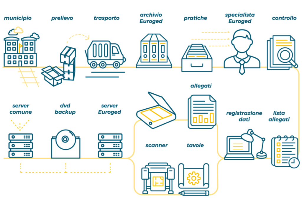 Il personale Euroged preleva i faldoni dagli scaffali del Comune e li trasferisce nel laboratorio di Rivoli (TO), dove vengono custoditi in un idoneo magazzino archivistico, a fine lavorazione Euroged restituisce le pratiche edilizie lavorate nel locale indicato dal Comune.